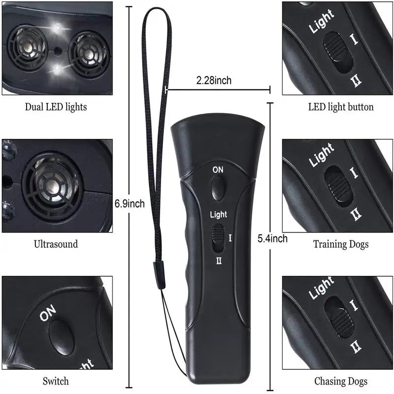 • Ultrasonic and Laser Technology :The device uses both ultrasonic and laser technology to repel dogs, making it more effective than traditional training methods.